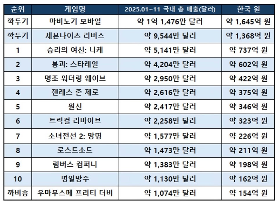 2025韩国市场二游年收入榜:米哈游库洛大获全胜,前五占四席! | 游戏观点 | 游戏报道