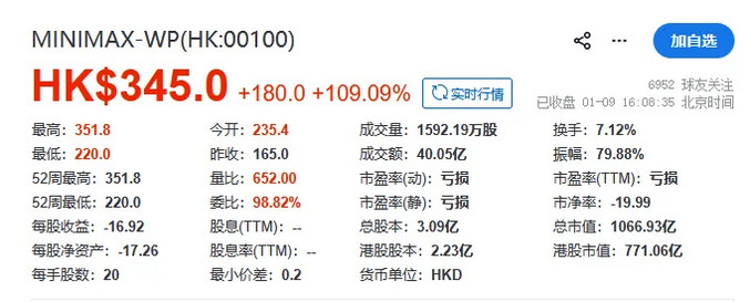 数据显示,MiniMax早盘以235.4港元大幅高开,较发行价165港元上涨42.7%。盘中买盘持续涌入,股价单边上行,最终收报每股345港元,全日涨幅定格在109.09%。按收盘价计算,MiniMax总市值达1065亿港元(约合137亿美元),不仅成为港股目前市值最高的AI原生企业,也标志着中国大模型产业正式进入千亿市值时代。