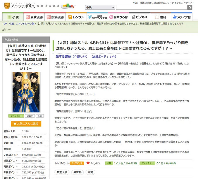 在该平台举办的第18届奇幻小说大奖中,一部名为《地味スキル「お片付け」は最強です!〜社畜OL、異世界でうっかり国を改革しちゃったら、騎士団長と皇帝陛下に溺愛されてるんですが!?〜》(暂译:《朴素技能“整理整顿时”是最强的!~社畜OL在异世界不小心改革了国家,结果被骑士团长和皇帝陛下溺爱了!?~》,以下简称《整理整顿》)的作品,在凭借高人气一举夺得“大奖”及“读者奖”双料桂冠后,被官方认定主要内容由生成式AI创作。