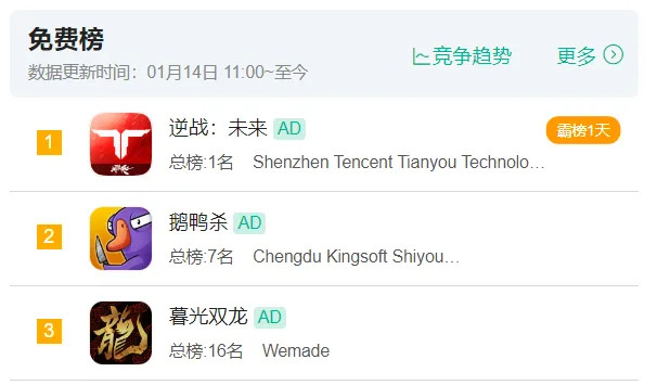 游戏新闻报道/最近这一周,尽管有人气派对《鹅鸭杀》,以及腾讯新游《逆战:未来》的接连上线,吸引了不少玩家和同行的目光,但一款名为《暮光双龙》的手游却在1月13日上线后,悄然跻身国区iOS游戏免费榜前三。