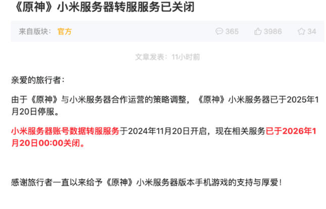 早在2024年11月,《原神》发布公告称,由于与小米服务器合作运营的策略调整,游戏即将停服,并开启了转服服务。2025年1月20日,《原神》小米服务器正式停服,同步关闭小米服的充值入口与新用户注册。