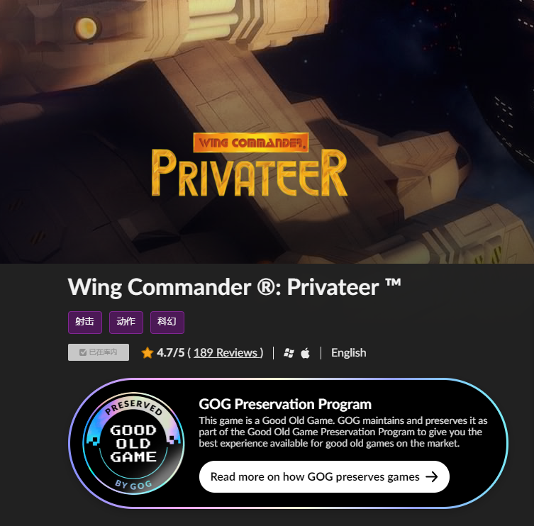 在这个项目中的老游戏会被GOG针对性地维护和二次优化,在商店中也会标上一个特殊的Good Old Game标签。顺着这个标签,我确实和很多老游戏重逢了。比如《银河飞将》系列的衍生作品《银河飞将:私掠者》,这个游戏可以说正是《星际公民》的前身,制作人罗伯特的诸多远景,在这一作中已经埋下了种子。