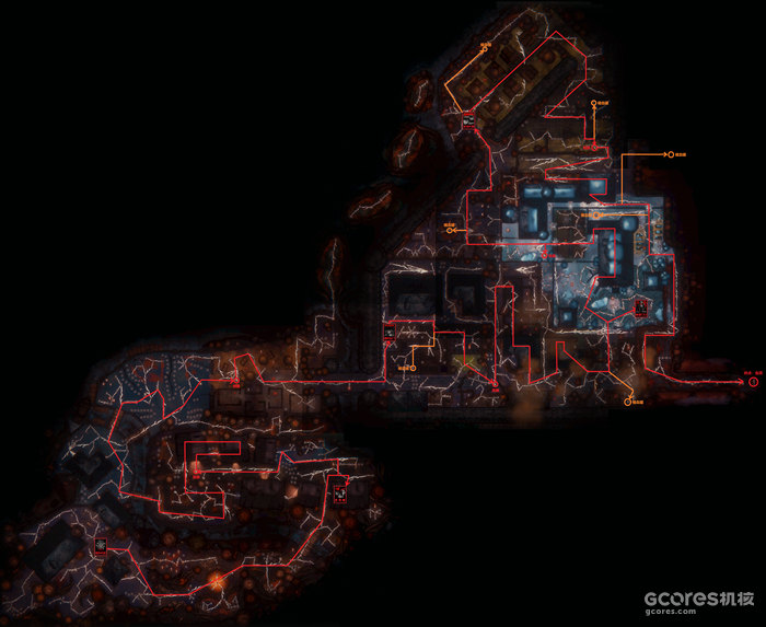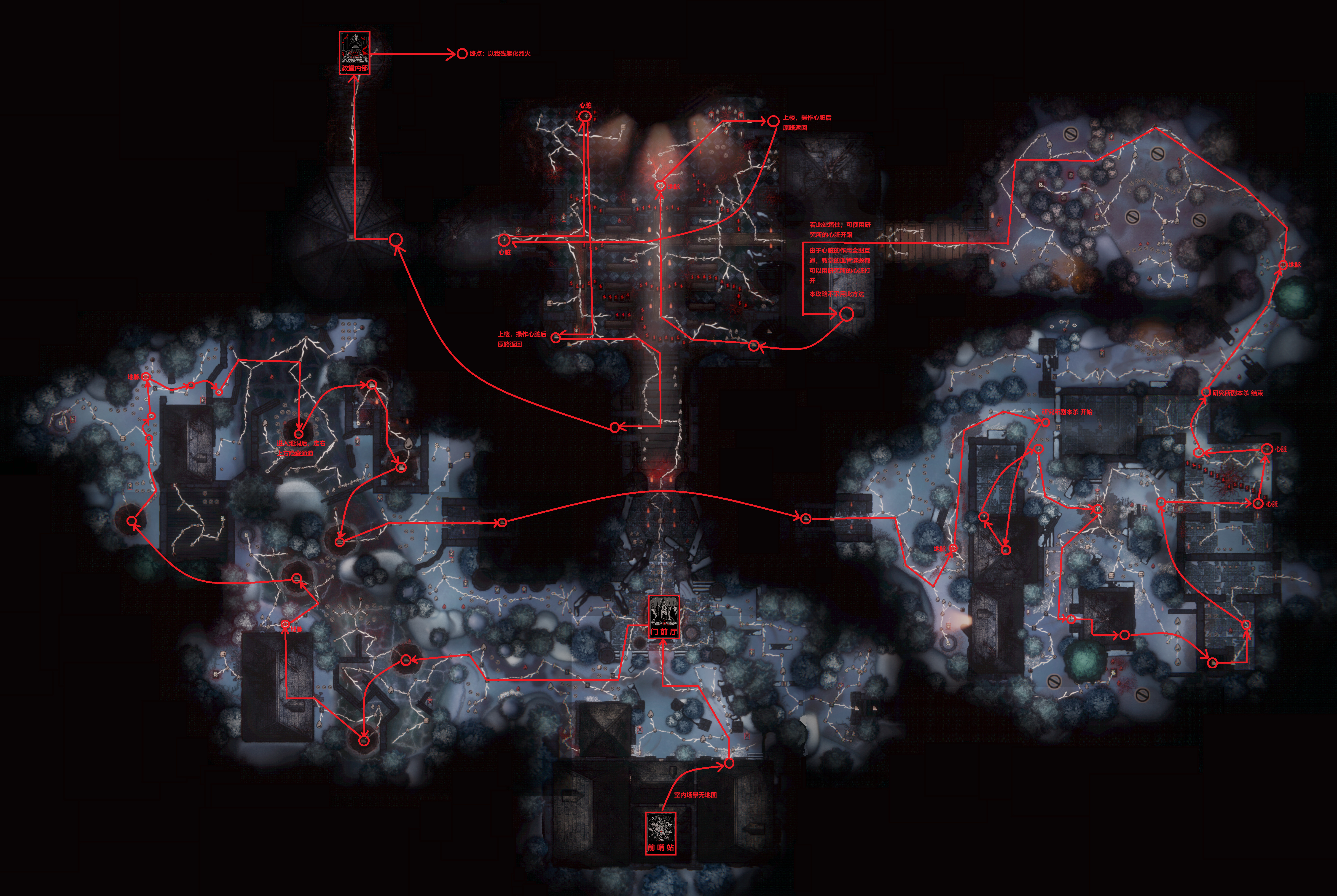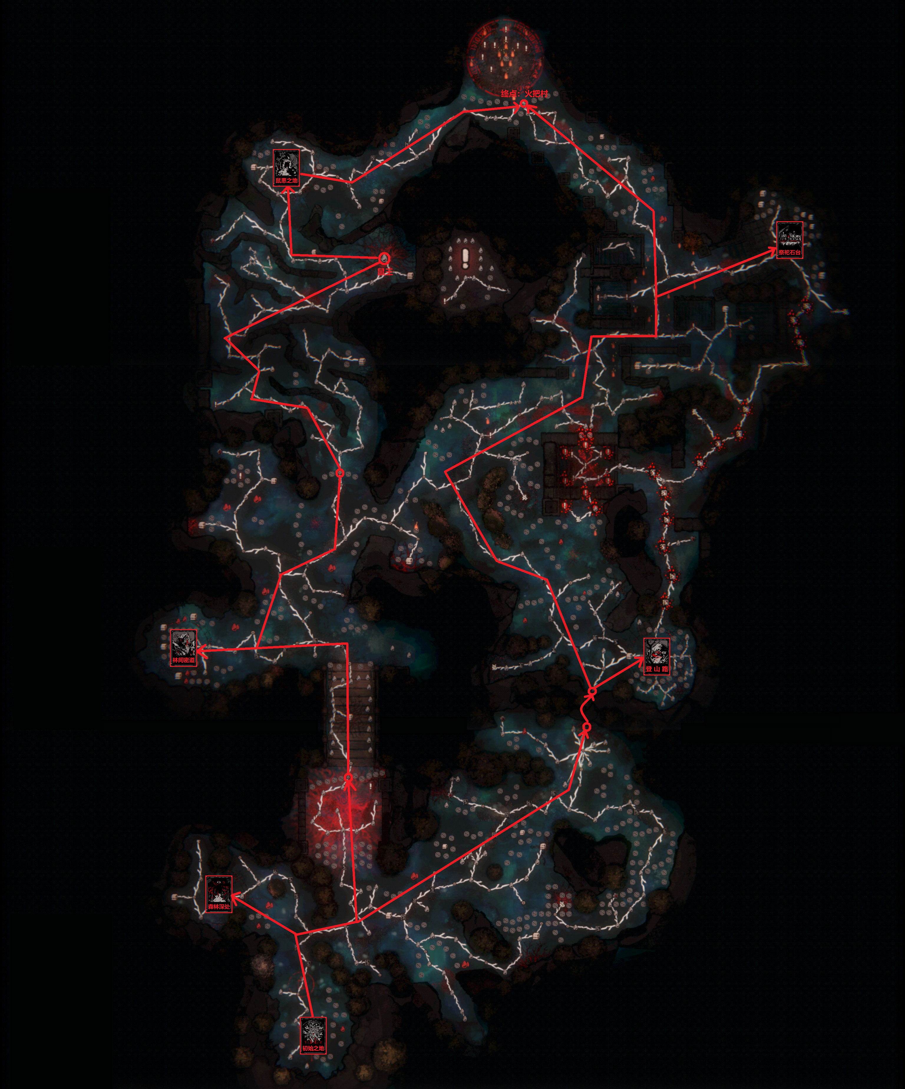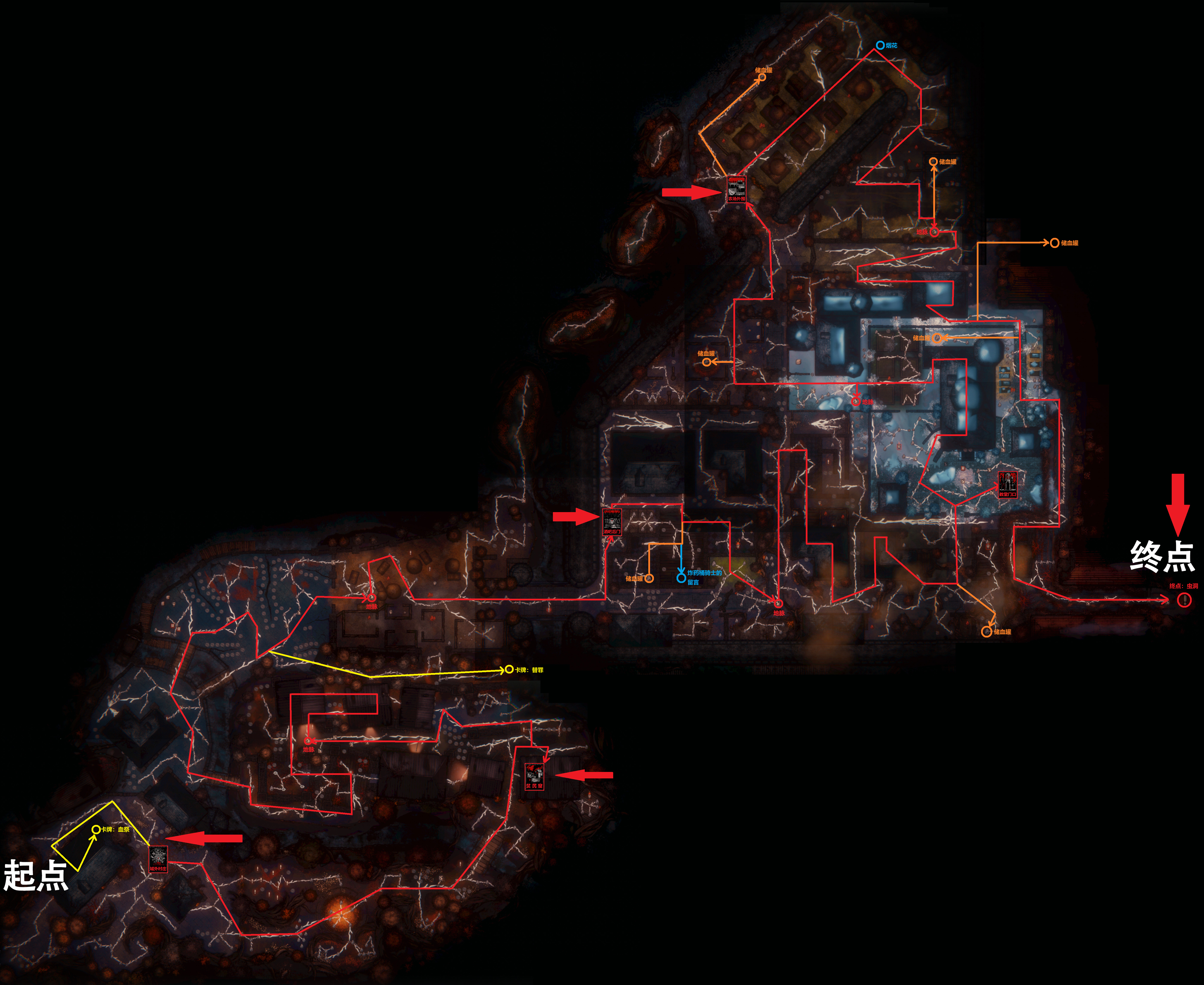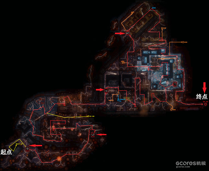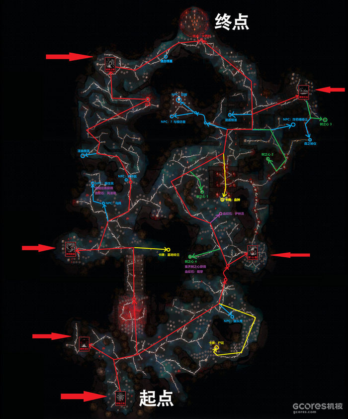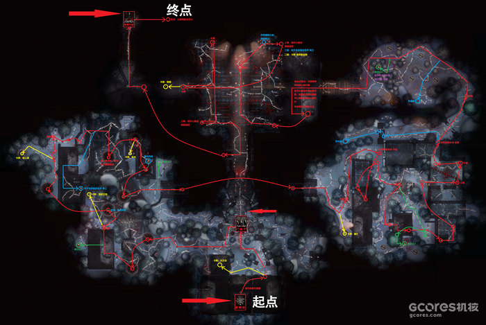 红色路径为主线,红色箭头所指的卡片为出生点。