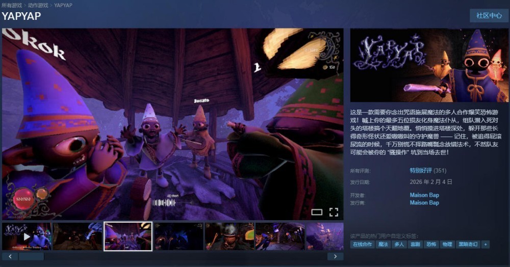 作为一款小成本的独立游戏,《YAPYAP》由Maison Bap工作室制作并发行,于2026年2月4日正式在Steam上发售,发售后短短不到24小时峰值在线人数就突破8000人,目前Steam商店界面显示玩家的好评率也接近90%。