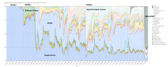 这张图表是“类吸血鬼幸存者”游戏的第四阶段。我想到了《Deep Rock Galactic Survivor》。注意看,它基本上是最后一款成功突围并对《吸血鬼幸存者》和《Brotato》这两款头部游戏构成挑战的作品。