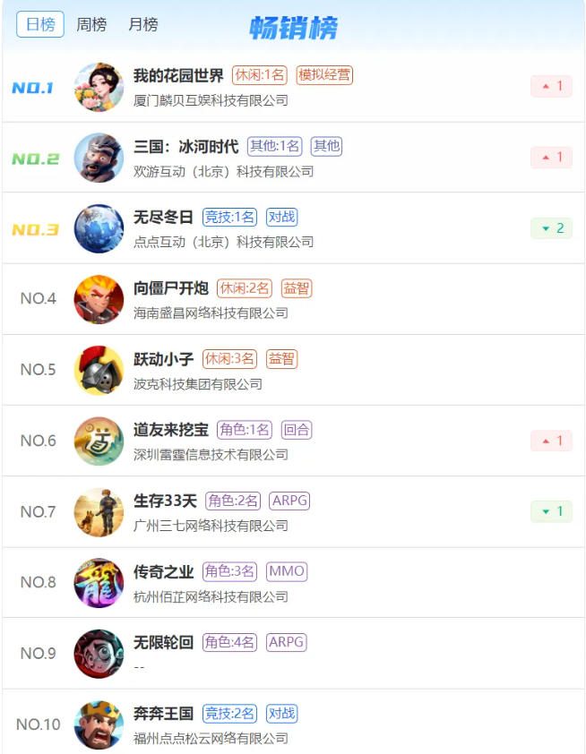 前十名其余几个位置,如《向僵尸开炮》、《跃动小子》、《道友来挖宝》、《生存33天》、《传奇之业》等,都是常年霸榜的老游戏。