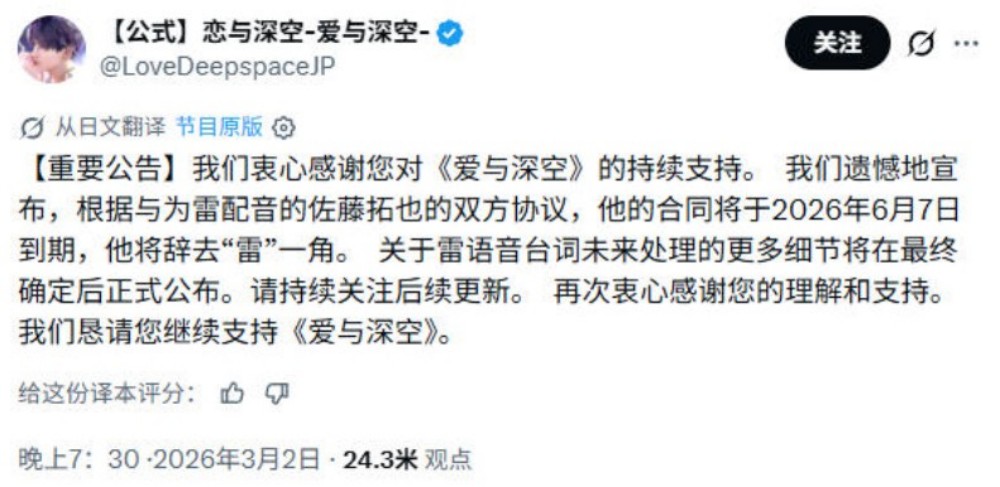 3月2日,叠纸游戏旗下《恋与深空》率先在X平台发布公告,宣布声优佐藤拓因“合同期满、协商一致”,将于同年6月正式卸任角色“黎深”的配音工作;紧随其后,3月3日鹰角网络也在《明日方舟》中以及X平台发布通告,称饰演“月见夜”与“12F”的佐藤拓也将因“各种原因”退出,并承诺尽快替换现有语音。