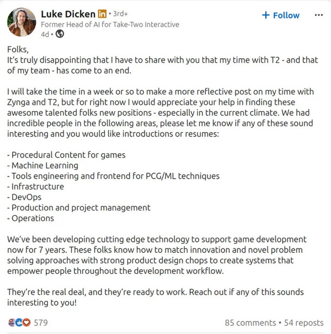 这位在2025年初刚刚就任Take-Two AI负责人的游戏老将,在帖子中写道:“我非常遗憾地与大家分享,我与T2的缘分,以及我的团队,已经走到了终点。”