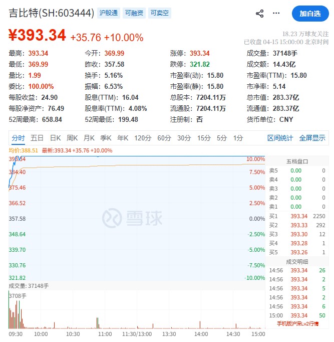 4月15日开盘后不久,吉比特股价便触及涨停,全天被牢牢封在393.34元的涨停价位上,涨幅10.00%。尽管盘中曾短暂打开,但汹涌的买盘迅速将股价重新推至涨停并维持至收盘,全天成交额高达14.43亿元,总市值也随之攀升至283亿元。