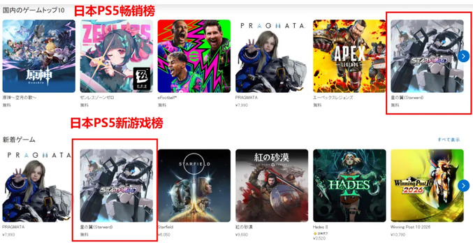 4月16日,盛天游戏把《星之翼》推上了PlayStation商店。而就在上线后不到一天,这款免费美少女对战游戏悄悄爬上了日区PS新品榜的第二位,仅次于卡普空酝酿多年的科幻大作《Pragmata》。而在日区PS整体畅销榜上,它也跻身成功前十、位居第6名。