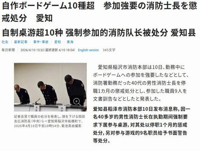 游戏新闻报道/据日本《每日新闻》及《朝日新闻》报道,爱知县稻泽市消防局于4月10日宣布,对一名40余岁的消防警长予以停职一个月的纪律处分,并向同期参与活动的九名消防队员发出书面警告。
