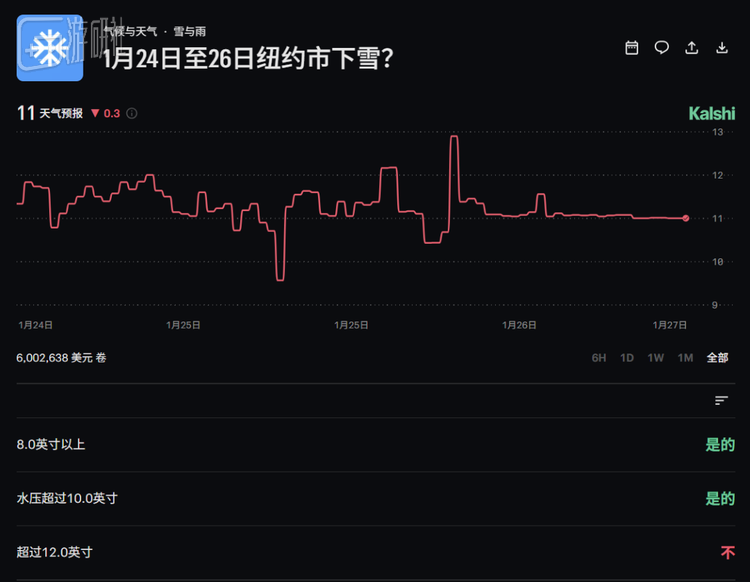 天气预测只是这场扩张里的一个新战场,但增长很快。今年1月纽约暴风雪期间,光是Kalshi上的降雪量合约交易额就突破了600万美元——对天气赌局来说已经是历史级别的数字,虽然和体育、政治比起来还只是零头。