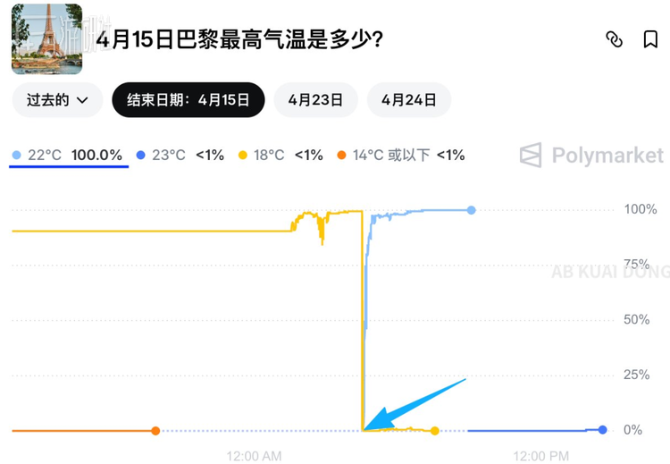 押注金额不大,合约价格便宜得像废纸,因为几乎没人相信4月中旬的巴黎阴天能到22度,所以赔率极高。但随着传感器“记录”到了22°C,合约自动兑现,每一份赔付1美元。仅这一次,获利约2万美元。