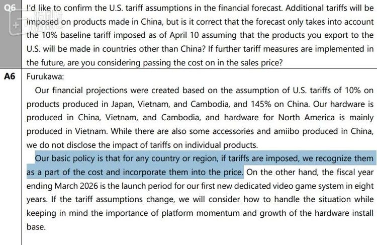 在玩家起诉任天堂的案件里,律师在诉状里直接引用了任天堂社长古川俊太郎在2025年5月财报说明会上的发言:“如果被征收关税,我们会将其视为成本的一部分,并将其计入价格之中。”
