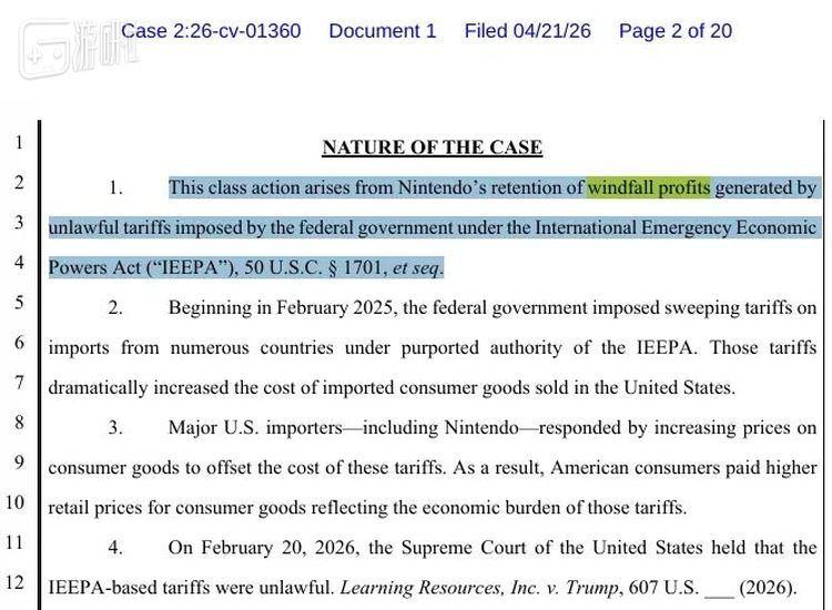 也就是在路透社报道的同一天,任天堂美国公司便向美国法院提起诉讼,要求政府全额退还关税、利息及律师费,声称这笔钱本就该“物归原主”。