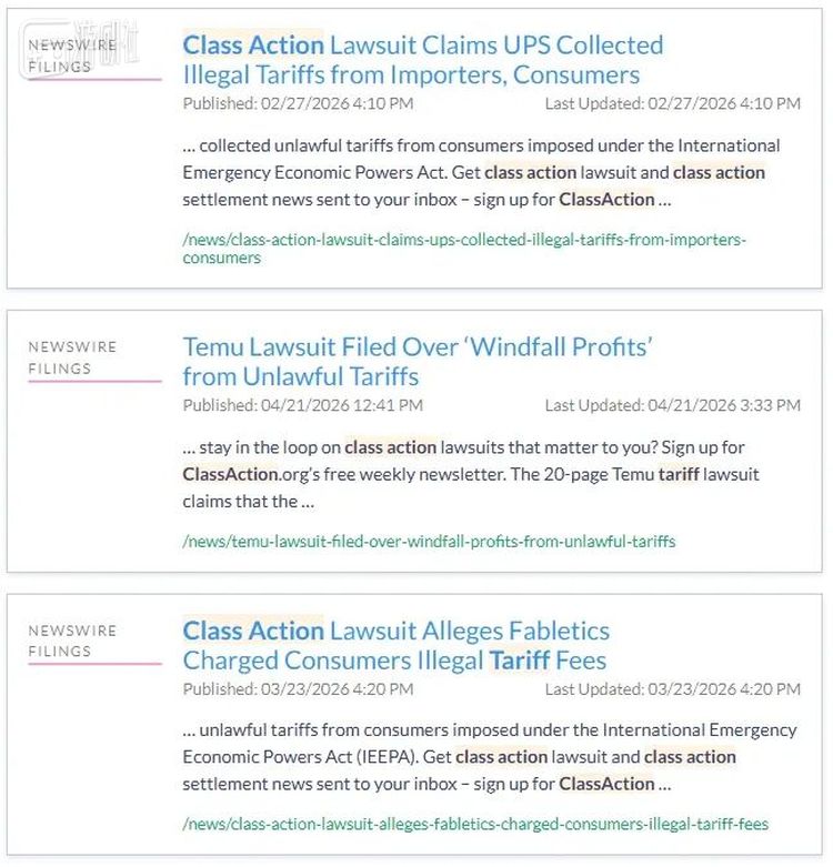 正是受到FexEx等公司的启发,自额外关税被判为“非法”后,美国各地不断有消费者发起集体诉讼,被告席上不乏索尼、三星和Temu等知名巨头公司。