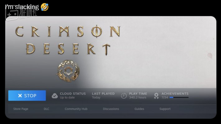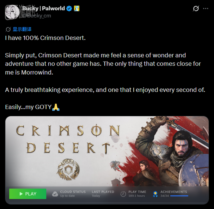 前两天,《幻兽帕鲁》的社区经理Bucky,在推特发帖宣布自己已经拿下《红色沙漠》Steam全成就,并顺手晒出了完成度100%的截图。