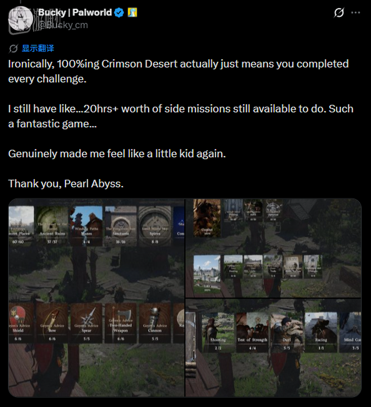 Bucky补充表示,全成就仅代表目前完成了所有挑战任务,不代表所有内容已经体验完毕,他认为目前游戏中至少还有20小时以上的支线内容没有触及,这个世界也还有不少东西等他回头仔细感受。