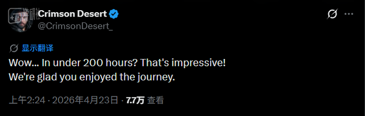 这件事不仅引起了不少玩家的注意,就连Pearl Abyss官方也颇为震惊,甚至还在Bucky的评论区回复道:“哇……在200个小时以内完成?实在令人佩服!”