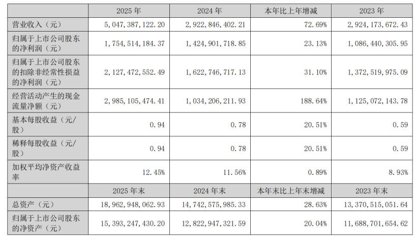 年报显示,巨人网络2025年实现营业总收入50.47 亿元,较上年同期增长 72.69%;归属于上市公司股东的净利润 17.55 亿元,同比增长 23.13%;扣非归母净利润21.27 亿元,同比增长 31.10%。