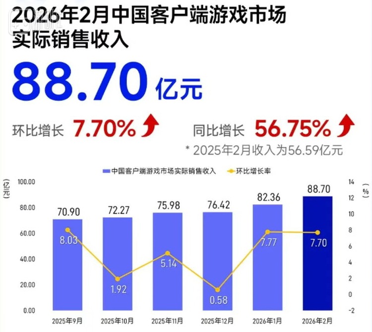 如果说产品调优解决的是能不能留下玩家这个问题,那么多端互通则直接关系到用户规模的扩张程度。近年来,国内客户端游戏市场持续回暖,已成为行业增长的核心引擎之一。根据伽马数据《2025年中国游戏产业报告》,2025年客户端游戏市场实际销售收入达到781.6亿元,同比增长14.97%,多款热门移动游戏新品在PC端的同步发行,成为了推动端游回暖的关键驱动力。进入2026年后,这一增长趋势进一步强化,《2026年2月中国游戏产业月度报告》显示,今年2月,国内客户端游戏市场收入达88.7亿元,同比增幅高达56.75%,成为当前游戏市场最具确定性的增长板块之一。