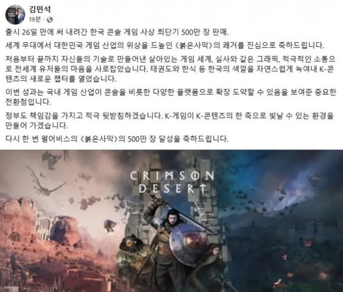 他所祝贺的,是Pearl Abyss旗下动作冒险游戏《红色沙漠》这款游戏于3月中旬正式上线,仅用26天便完成了500万份全球累计销量,创下韩国主机游戏史上最快达成这一里程碑的纪录。