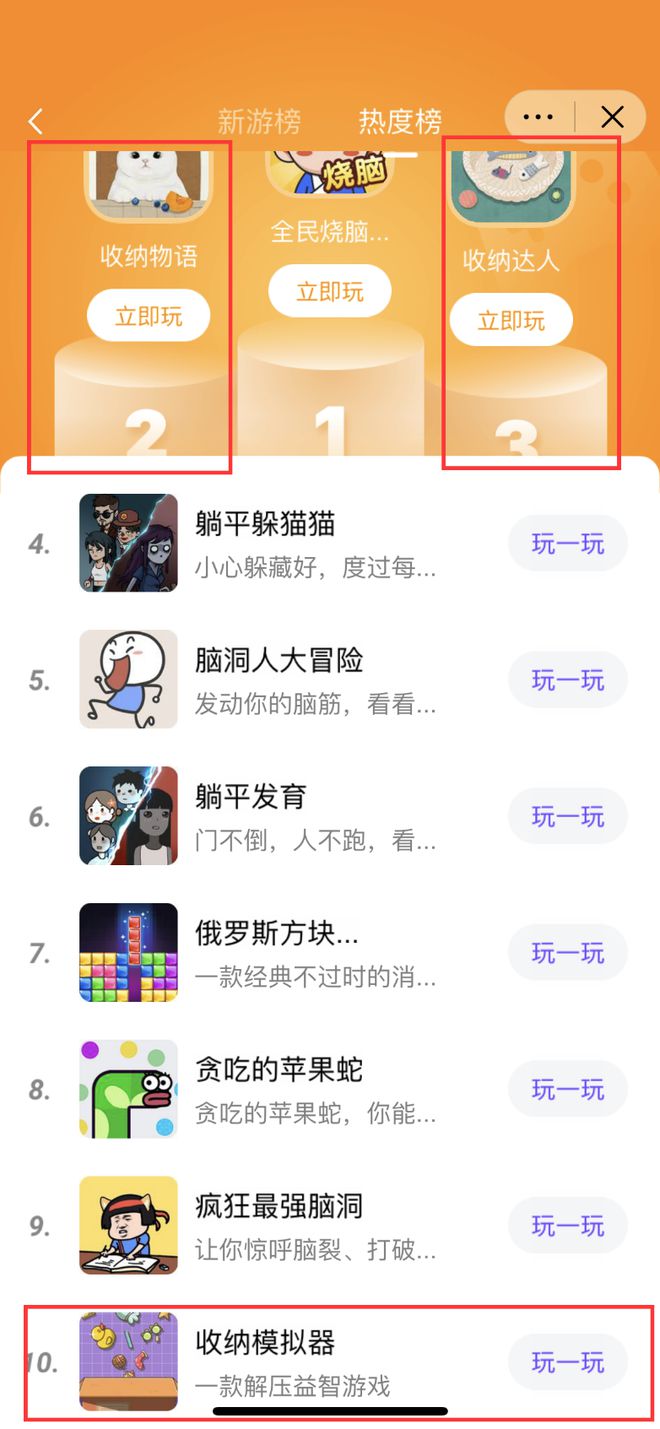 打开抖音小游戏热度榜,我们发现,在TOP10的榜单中,收纳小游戏多达3款。