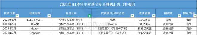 沙特主权基金(PIF)也是今年海外投融资火爆的重要“推手”之一。在今年1月沙特主权基金(PIF)以15亿美元收购知名电竞公司ESL以及竞技游戏平台FACEIT;2月,PIF又向日本的Capcom以及Nexon Japan共投资了超过12亿美元,收购了两家公司各5%的股份;5月,PIF花费30亿美元购入了任天堂 5.01% 的股份,成为任天堂第五大股东。