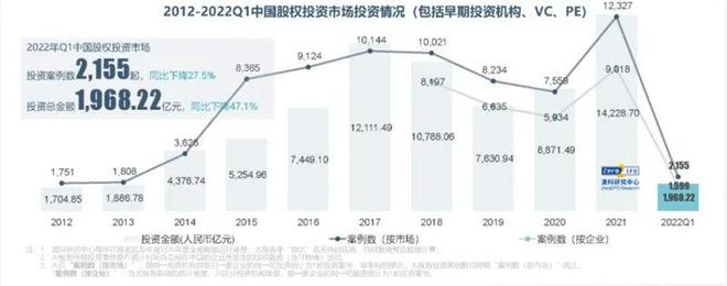 据清科研究中心相关数据显示,2022年第一季度中国股权投资市场共发生2155起投资,同比下降27.5%;披露投资金额为1968.22亿元,同比下降47.1%。