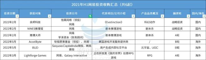 今年策略依旧,上半年网易游戏发起的6起投融资中,有3起落在海外。投资对象包括美国游戏开发者后端服务平台AccelByte、元宇宙社交平台BUD、美国游戏开发商LightforgeGames。
