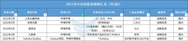 与腾讯、网易不同,今年上半年B站仍旧关注国内二次元游戏团队,投资了龙拳风暴、火箭拳、炎魔网络等游戏厂商。此外,也在小规模试探了海外市场,入股了芬兰初创公司Yahaha Studios,该公司成立于2020年,创始团队主要来自于Unity,旗下有3D互动内容与社交平台“Yahaha”。这两年,B站一直在加码二次元,希望以此获得更多优质游戏代理发行权。