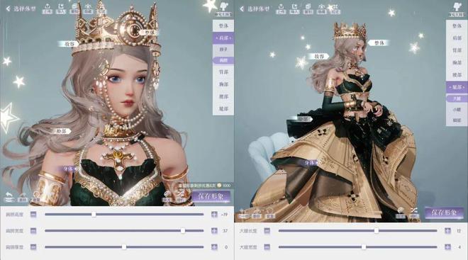 首先是骨相的部分。游戏将角色的身体和面部结构细细拆分,设计了在女性向游戏中非常少见且丰富的细节参数,玩家可以根据自己的喜好和审美,调整肩、臂、胸、腰、腿等身体各部位的曲线,改变脸部五官甚至是骨骼的生长状态等,把角色从头到脚都调整成理想的形状。