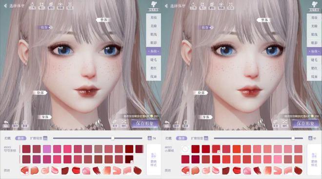 其次是皮相的部分。包括眼影、美瞳、腮红等在内,《以闪亮之名》提供了非常完整的妆容款式和颜色供玩家“化妆”。尤其让人惊喜的是唇妆,他们将各种现实中热门的口红色号和常见的口红质地复刻进了游戏中,甚至还设计了叠涂的功能,以此丰富玩家的捏脸自由度,尽可能让玩家收获真实的化妆体验。