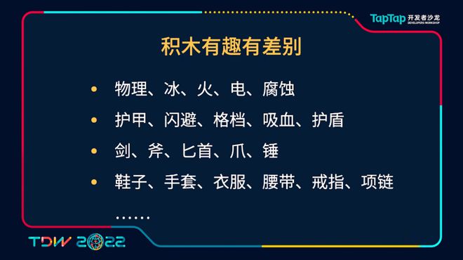 我们说到积木也不只是一个简单的数量多,它需要每一个都有所差异有所不同。而且这些差异不仅仅是养成上的差异,更多的包括可以在战斗体验上也都能形成差异。比如说在伤害类别里有物理、冰、火、电、腐蚀,每一种它都是有所不同的。冰可以更好的对玩家进行控制、减速,电每次伤害都能造成附加的伤害,对于高攻速的BD是更加适用,而腐蚀更加适合持续性的一些伤害,它的战斗体验会有所不同。