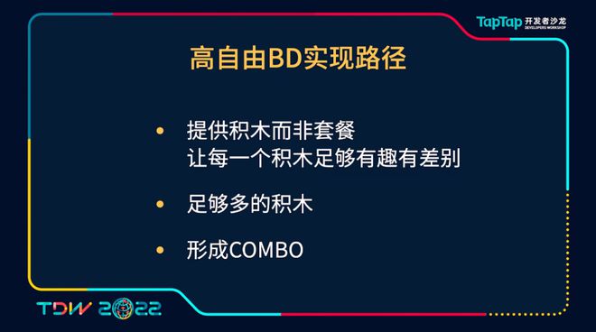 首先我们是给玩家提供的不是套餐,而是积木,因为每一个积木是具有原子性的,它是具有更加可扩展更好的与其他积木进行一个组合。第二个我们就是让每一个积木都非常的有趣有差别。第三个我们要提供足够多的这种积木,之后再将这积木能有机的有效的进行组合,形成Combo。