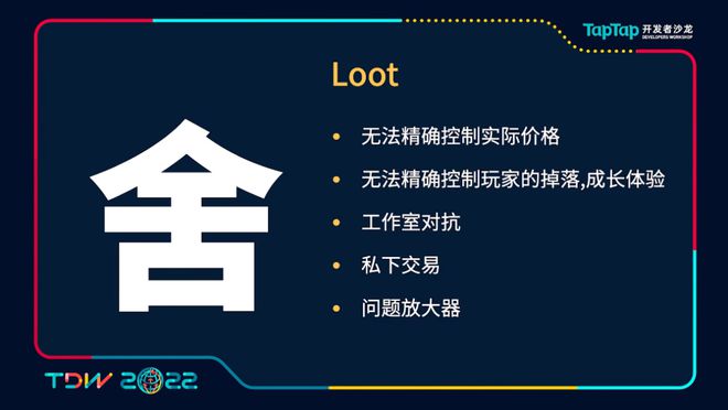 但是要做到这些点,其实我们也舍弃了不少的东西。首先我们无法精确地控制整个游戏的价格,我们只能控制我们的价值以及我们的掉率,但是没有办法精确控制价格,也因此我们无法完全控制玩家的整个的掉落节奏和成长体验。