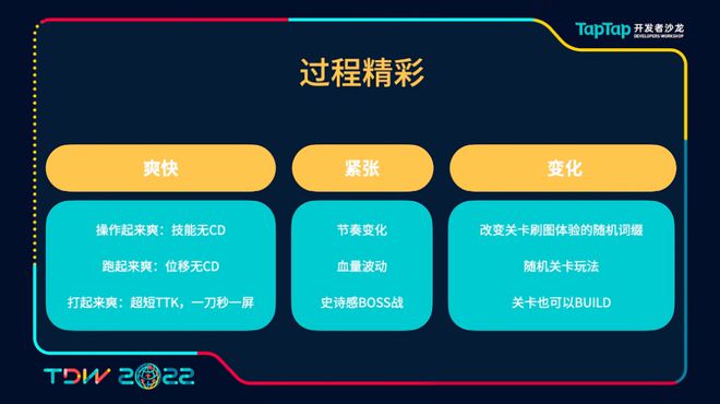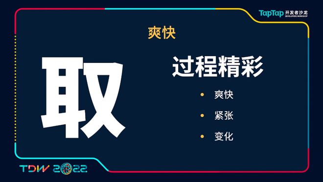 我们游戏的第三个支柱就是爽快。说爽快,其实在整个过程中,我觉得用过程精彩来描述其实更加的准确。说到过程,其实现在越来越多的游戏经常会跳过这个过程,因为这个过程不好做,所以我们可能会用一些挂机或其他游戏直接跳过过程,让玩家直接注重到结果上,获得更加直接的反馈。