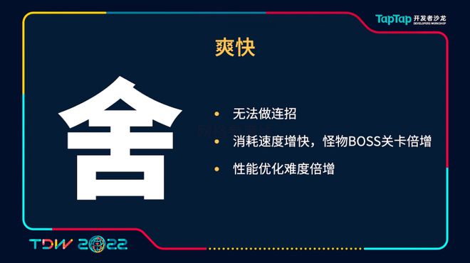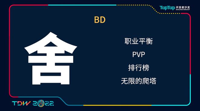 当然为了做到这些,其实我们也不得不舍掉了一些东西。首先就是在这样一个高自由度的组合里,其实我们的策划也无法穷尽所有的可能性,所以我们无法做到一个绝对的职业平衡。因为我们无法做到职业的绝对平衡,所以说很多系统我们其实也不得不放弃的,因为这些系统会把这个缺点更进一步的放大,所以我们没有去做PVP,没有去做排行榜,也没有去做一个无限的爬塔。