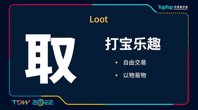 我们游戏的第二支柱就是Loot,在Loot中我们强调一定要做好的是打宝体验。我们强调的是整个打宝的乐趣,为此我们做了自由交易,做了以物易物,我们希望玩家整个打宝的过程,只要玩家愿意投入时间进去,就能像付费玩家抽卡一样,不断的持续的能有这种开宝箱获得惊喜的这种体验。