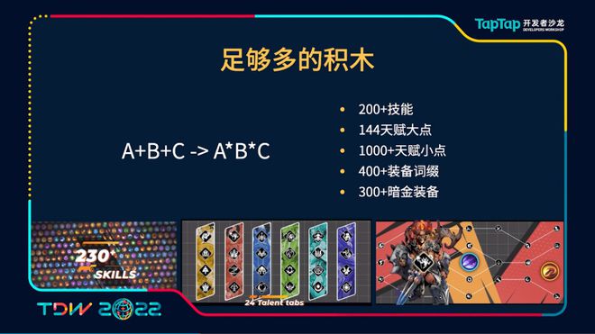 另外的话我们还让这些积木做的尽量的足够的多,我们整个游戏的话有230个技能,而且这个数字也一直在增加,我们有24个天赋版,其中包含了144个天赋大点,1000个天赋小点以及装备上有400多条不同的装备词缀,有300多件不同的暗金。而让这些东西通过机制把它们给串联起来,天赋装备、技能暗金都能产生相互的协同效应,从一个加法的组合变成一个乘法的组合,这样也能更接近于我们游戏的名称:《火炬之光:无限》,能给玩家提供尽量多的这种可能性。让玩家能做出很多的选择,而且这些选择是有意义的选择。