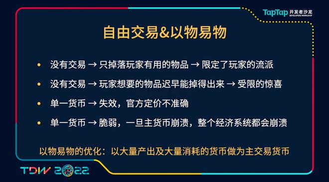 为什么最后又会变成一种以物易物的这种多货币的交易方式?可以从暗黑三来聊起,因为暗黑三之所以最后没有交易,因为也是他们当时交易行出现过后,整个经济系统产生了崩溃,所以他们的方案是去关闭交易。我们的方案其实是希望通过以物易物的方式去解决掉这种问题,为什么用以物易物可以去解决或者规避它的问题?