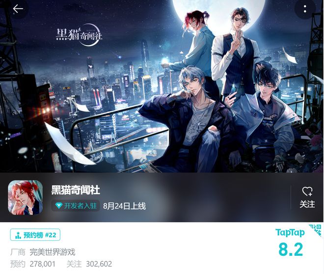 于国内,完美世界的新品储备也颇丰,年内已拿到《黑猫奇闻社》的版号。目前《黑猫奇闻社》已定档8月24日。该游戏在玩家中的评价较为不错,好游快爆2.1万人预约,评分9.0;TapTap27万人预约,评分8.2。