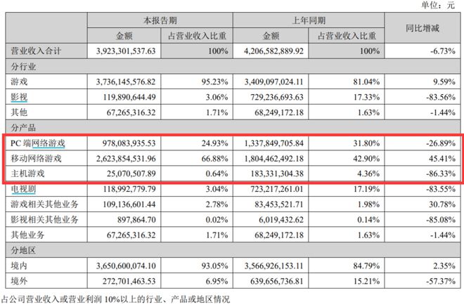 在收入构成上,完美世界的营收主要来自游戏和影视两大业务。期内游戏营收37.4亿元,同比增长9.59,占总营收81.04%。其中,移动游戏营收26.23亿元,同比增长45.41%,PC游戏营收9.78亿元,同比减少26.89%;主机游戏业务营收0.25亿元,同比减少86.33%。