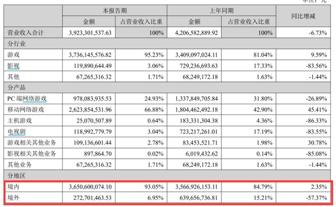 上半年,完美世界游戏业务营收37.4亿元,同比增长9.59%;归属上市股东净利润11.8亿元,较去年同期增长429.7%;影视业务实现收入1.2亿元,同比下降83.56%,归属上市股东净利润为0.41亿元。