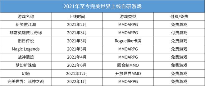 据游戏陀螺粗略统计,2021年完美世界自研上线游戏产品包括《新笑傲江湖》《非常英雄救世奇缘》《旧日传说》《梦幻新诛仙》《幻塔》等。其中,《梦幻新诛仙》《幻塔》表现颇为不错。