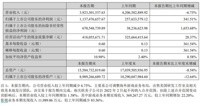 近日,完美世界发布了2022年上半年业绩报告。报告显示,完美世界上半年营收39.2亿元,同比下降6.73%;归属上市股东净利润11.4元,同比上升341.5%;扣除非经常性损益后净利润6.7亿元,较上年同期上升1653.68%。