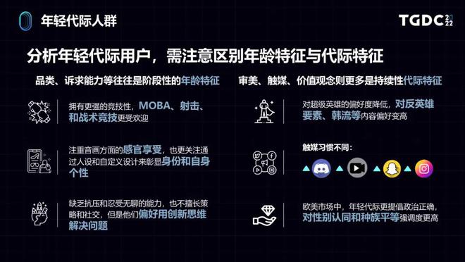 年龄特征指的是用户由于到了某一个特定的成长阶段而表现出来的特征,可能每一个代际的用户都会迈入到这条河流。比较典型的是年轻人都偏好竞争、对抗,这一点就会影响到他们的品类选择;又比如年轻用户更偏好高质量的感官享受,希望有更多的个性化内容体现自己的身份和特征,这个也跟他们处于一种自我彰显的成长阶段相关;同时,年轻用户也会更难以忍受无聊,更希望用创新的思维解决问题。这些我们认为都更偏年龄特征。
