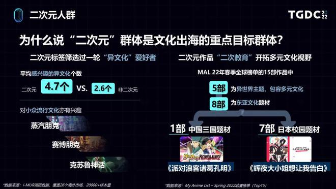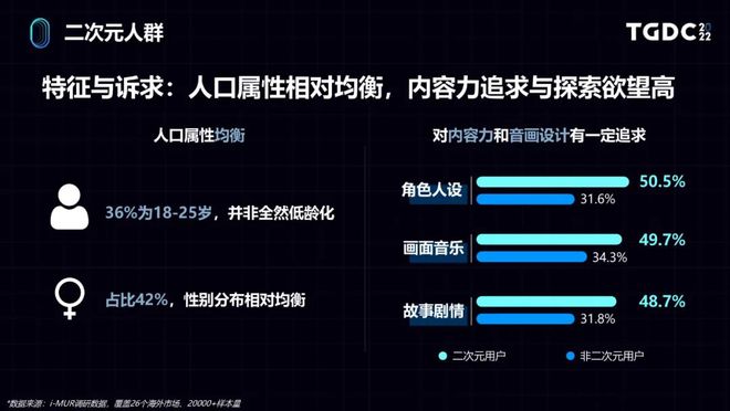 比较突出的是他们在内容力和音画设计上有一定的追求,在角色、人设、画面、音乐和故事剧情上的诉求,都要显著高于非二次元用户。也正是因为他们对于内容力的高追求、高探索欲望,对文化出海而言既是机会也是挑战。