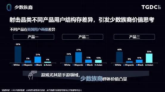 首先是少数族裔人群。在这些年来,我们对于海外跨区域市场的研究当中已经逐步地意识到在年龄、性别之外,文化底色是一个非常重要的对用户进行分析的人口属性。尤其是在射击近年来大热的品类上,这个感知更明显。