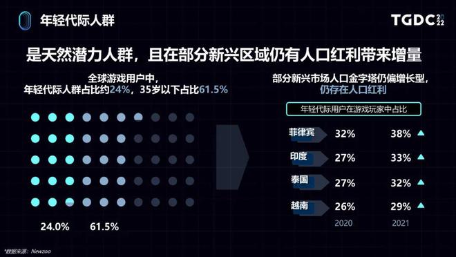年轻代际人群的价值点几乎不用再赘述,由于其成长阶段、他们是天然的潜力群体;同时,因为宏观原因,在不少的新兴市场,他们的人口还处于上窄下宽的增长型金字塔的结构,这种人口红利也将映射到游戏市场的用户上。